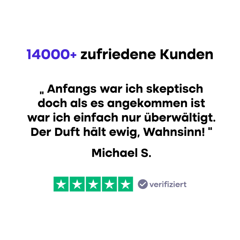 Überleg mal: Mit unserer 30-Tage-Geld-zurück-Garantie kannst du absolut nichts verlieren. Wenn wir nicht das halten, was wir versprechen, schickst du den Flakon einfach zurück. Tausende Kunden haben bereits gemerkt, dass die Düfte ihre Erwartungen teils übertreffen – schau dir unsere Bewertungen an. So oder so: Kein Risiko, nur die Chance, dich in einen traumhaften Duft zu verlieben.